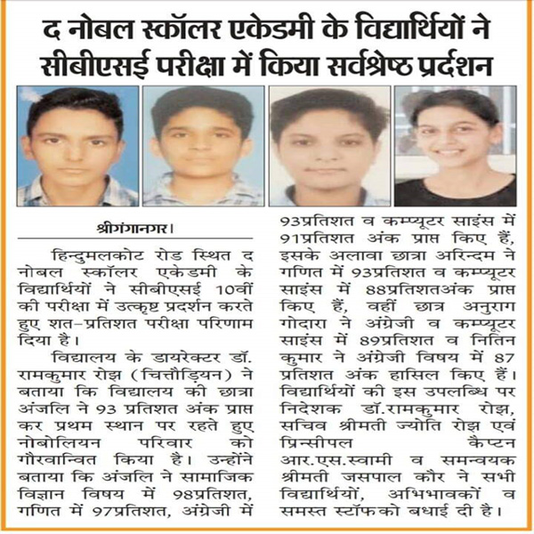 • THE NOBLE SCHOLAR ACADEMY is situated at HINDUMAL KOTE ROAD, KALIYAN, SRIGANGANAGAR (RAJASTHAN). This institution has made the dream of several students of getting admission in Military School come true and many students have been selected in Navodaya Vidyalaya. Along with studies, this institution prepares for sports competitions, Military School Entrance Exam, Navodaya Vidyalaya Entrance Exam and also gives children the best values and the ability to live a better life in the society. By organizing cultural programs from time to time, we always try to boost the morale of the children.